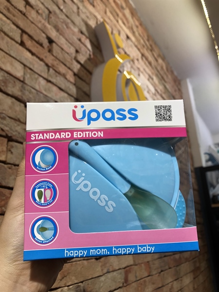 Bát ăn dặm + thìa báo nóng Upass (Xanh)